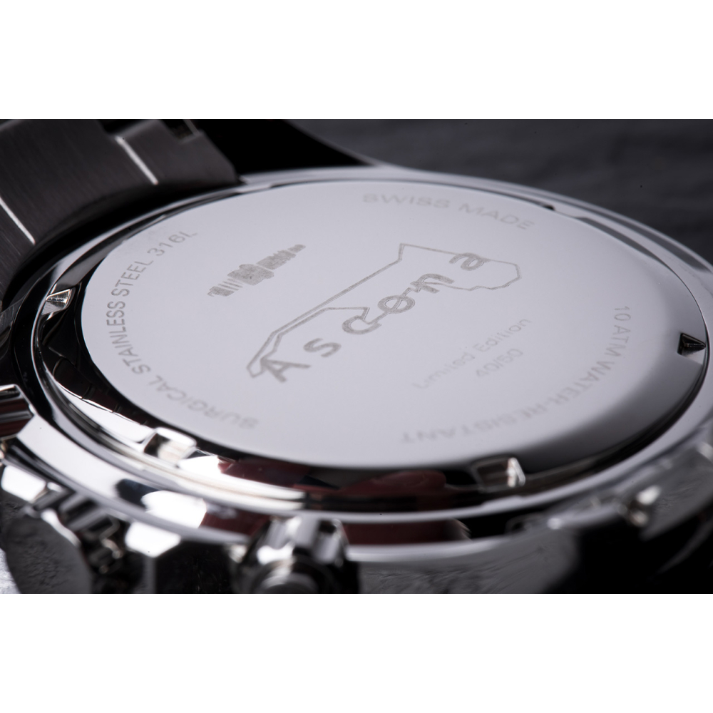 Strap width: 22 mm | Case: Stainless steel | Caseback: Engraved Ascona City limits | Movement: Swiss Made Quartz Ronda 5040.D | Glass: Extra hardened Mineral Crystal | Functions: Hours, Minutes, Seconds, Date Indication & Chronograph | Water-resistent: 10 ATM | Up to 100 meters